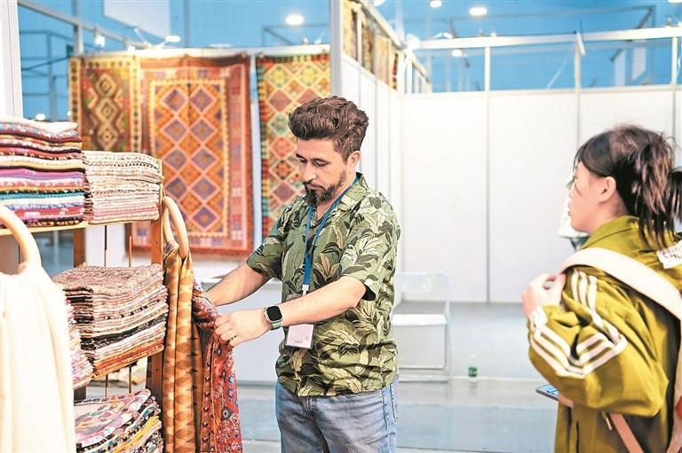 འགྲེམས་སྟོན་ལ་ཞུགས་པའི་ཚོང་པས་མཚོ་སྔོན་གྱི་ཁྱད་ལྡན་ཐོན་རྫས་ལ་རྒྱུས་ལོན་བྱེད་བཞིན་པ།