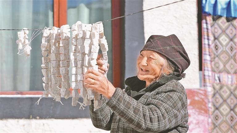 ལོ74ལོན་པའི་བློ་བཟང་དར་རྒྱས་ར་སྐོར་ནང་དུ་བསྡད་དེ་ནོར་གཡག་གི་སྐེ་ཕྲེང་བཟོ་བཞིན་ཡོད་ལ། ཁ་མདོག་རྣམ་པ་བཀྲ་བའི་སྐུད་པ་མཛུབ་རྩེ་ནས་དཀྲི་སྟེ་ཐུན་མོང་མ་ཡིན་པའི་དཔེ་རིས་སུ་གྲུབ། ཁོའི་ཆུང་མས་འགྲམ་དུ་ཕྱུར་བ་སྐམ་བཞིན་ཡོད་ལ། དག་གཙང་གི་ཕྱུར་བས་ཉི་འོད་འོག་ཡིད་དབང་འཕྲོག་པའི་འོད་འཕྲོས་བཞིན་ཡོད། ལོ་ལོན་གཉིས་ཀྱི་གདོང་དུ་བདེ་སྐྱིད་ལྡན་པའི་འཛུམ་གྱིས་ཁེངས། “ཁྱིམ་གྱི་ཕྱུགས་ཟོག170བུ་ཕྲུག་ཚོས་བདག་སྐྱོང་བྱེད་བཞིན་ཡོད་པས་ངེད་གཉིས་ཀྱིས་ལག་བཟོ་བཟོས་ནས་དུས་ཚོད་བེད་སྤྱོད་གཏོང་བཞིན་ཡོད”ཅེས་བློ་བཟང་དར་རྒྱས་ཀྱིས་བརྗོད། ཡང་ཁོང་གིས་ད་ལོར་གྲོང་ཚོའི་ཨ་ལྷན་གྱིས་འབྲི་མོ་7བྱིན་པས་ཚང་མ་གྲོང་ཚོའི་ཐུན་མོང་ནོར་གཡག་གསོ་སྤེལ་ལས་གཞི་ནང་ཞུགས་པར་སྣེ་ཁྲིད་བྱས། “ཚན་རིག་དང་མཐུན་པའི་གསོ་སྤེལ་སློབ་ཐུབ་པ་མ་ཟད། ལོ་མཇུག་ལ་ཁེ་ཕོག་བགོ་བ་དང་། འོ་མ། མར། ཕྱུར་བ་ཟོས་མ་ཚར་ན་ད་དུང་ཕྱིར་འཚོང་བྱས་ཆོག་པས་འཚོ་བ་སྔར་ལས་བདེ་སྐྱིད་དུ་གྱུར”ཞེས་ཟེར།